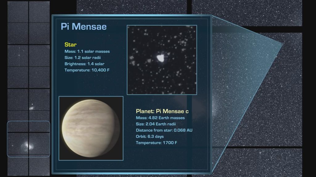 Pi Mensae è una stella nana gialla di dimensioni simili al nostro Sole, da cui dista 60 anni luce, visibile a occhio nudo, anche se non dalle nostre latitudini. Attorno ad essa nel 2001, sulla base di osservazioni condotte da terra, era già stato scoperto un pianeta, Pi Mensae b, un’enorme gigante gassoso di massa 10 volte superiore a quella di Giove, in movimento su un’orbita fortemente ellittica che lo porta ad entrare nella “zona abitabile” al periastro (1,21 AU) per poi allontanarsi dalla sua stella più di Giove rispetto al Sole (5,54 AU). Ora, grazie a TESS, è emerso che il sistema ospita anche una superterra, Pi Mensae c, grande circa il doppio del nostro pianeta, che percorre un’orbita circolare molto vicina a Pi Mensae in soli 6,3 giorni. Questa scoperta permetterà di gettare nuova luce su come questo strano sistema planetario si è formato.