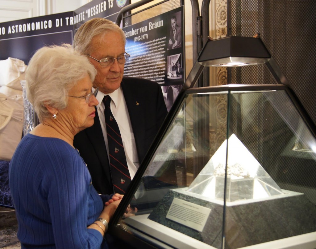 La roccia è stata concessa in prestito per un mese dalla NASA a Luigi Pizzimenti, direttore della sezione Astronautica dell’Osservatorio FOAM13 di Tradate, curatore del Padiglione Spazio del Museo del Volo Volandia e accreditato presso il Lunar Sample Laboratory Facility nel quale sono custodite le rocce lunari Apollo. Il 4 maggio scorso ho accompagnato Luigi a Houston per documentare giornalisticamente il viaggio e sarò con lui per le lezioni e conferenze che dedicheremo a questo straordinario campione di roccia extraterrestre.