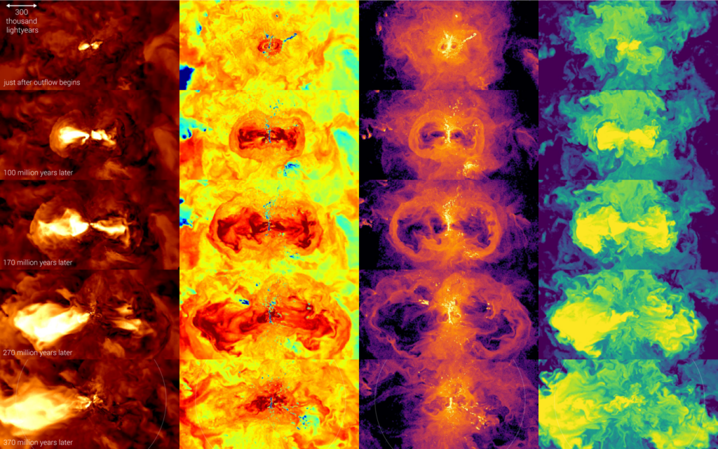 Man mano che la loro forma si appiattisce, e le stelle in formazione si dispongono in orbite circolari come in una giostra, ecco emergere dai dischi flussi di gas ad alta velocità, accelerati da fenomeni di supernova e dall’attività di buchi neri supermassicci centrali. Si vedono fussi gassosi inizialmente caotici che vagano in tutte le direzioni che man mano convogliano all’interno di due volumi conici, che emergono dalla galassia in direzioni opposte. Allontanandosi dal pozzo gravitazionale verso l’alone di materia oscura, perdono velocità e ricadono verso la galassia andando a disporsi lungo la periferia del disco come in una fontana. In questo modo accelerano la formazione e l’evoluzione della galassia stessa alimentando la nascita di altre giovani stelle, che vanno a disporsi in una forma sempre più appiattita di un sottile disco.