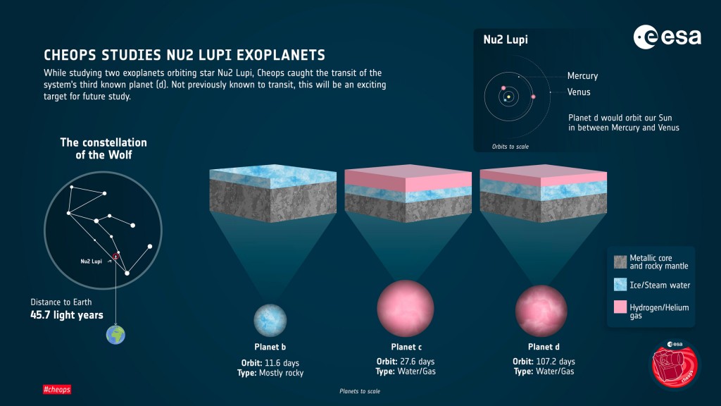 Combinando i nuovi dati di Cheops con i dati d’archivio di altri osservatori, i ricercatori sono stati in grado di determinare con precisione le densità medie di tutti i pianeti conosciuti del sistema di ν2 Lupi, e porre vincoli stringenti sulle loro possibili composizioni. Hanno scoperto che il pianeta ‘b’ è principalmente roccioso, mentre i pianeti ‘c’ e ‘d’ sembrano contenere grandi quantità di acqua avvolta da atmosfere di idrogeno ed elio. In effetti, i pianeti ‘c’ e ‘d’ contengono molta più acqua rispetto al nostro pianeta: un quarto della massa di ciascun pianeta è costituito da acqua, rispetto a meno dello 0,1 per cento della Terra. Quest’acqua, tuttavia, non è liquida, ma assume la forma di ghiaccio ad alta pressione o di vapore ad alta temperatura.