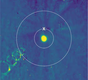 Questa immagine è stata realizzata combinando centinaia di immagini scattate tra agosto e metà dicembre dal LORRI (Long Range Reconnaissance Imager) a bordo della New Horizons. Ultima Thule è la macchia gialla luminosa nel mezzo, mentre i due cerchi concentrici indicano le due possibili distanze di passaggio per il flyby. La missione ha deciso di volare lungo il cerchio più vicino, verso il punto indicato da una X. I deboli cerchi sono tracce delle stelle di fondo, delle singole immagini a distanze diverse, che sono state eliminate dall’immagine composita per far risaltare Ultima. Crediti: NASA / Johns Hopkins Applied Physics Laboratory / Southwest Research Institute. Dalla sonda continuano ad arrivare quotidinamente le immagini di navigazione ottica di Ultima. Queste immagini, combinate con il tracciamento radio sempre da New Horizons, vengono analizzate per aiutare i navigatori a determinare se ci sia bisogno di aggiornare i file sul computer principale della sonda, per migliorare il puntamento e il tempo di avvicinamento più breve. «L’ultima possibilità di aggiornare questi file la avremo a solo un giorno prima del flyby stesso».