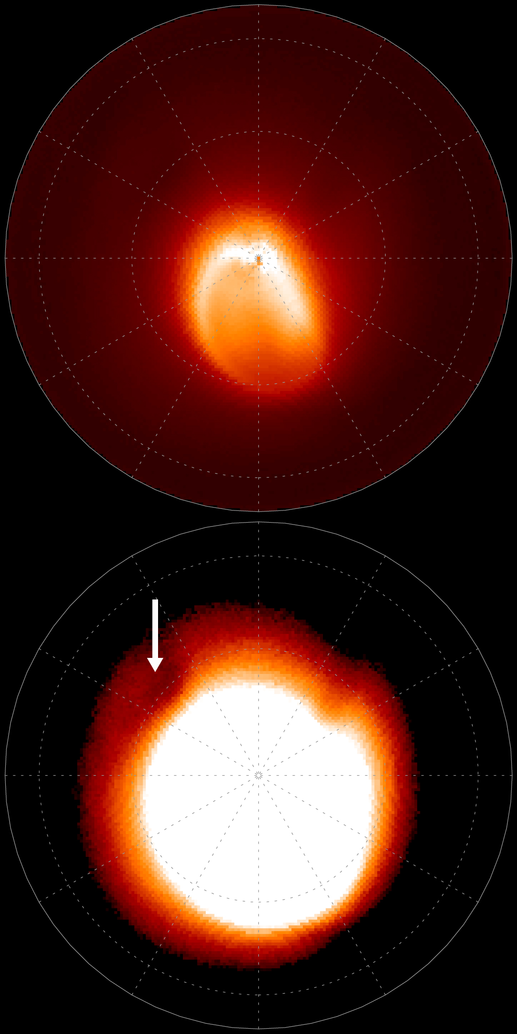 La scoperta è stata pubblicata su Geophysical Research Letters l’11 aprile ed è la prima volta che strutture legate al meteo vengono osservate subito fuori dai margini delle brillanti aurore del pianeta. Rispetto alla Macchia Rossa, questa è più instabile e cambia forma e dimensione in modo molto più drastico, in tempi che si misurano in pochi giorni o settimane, eppure è una struttura che è riappare periodicamente da almeno 15 anni, il che lascia pensare a un meccanismo in grado di ricrearla costantemente.