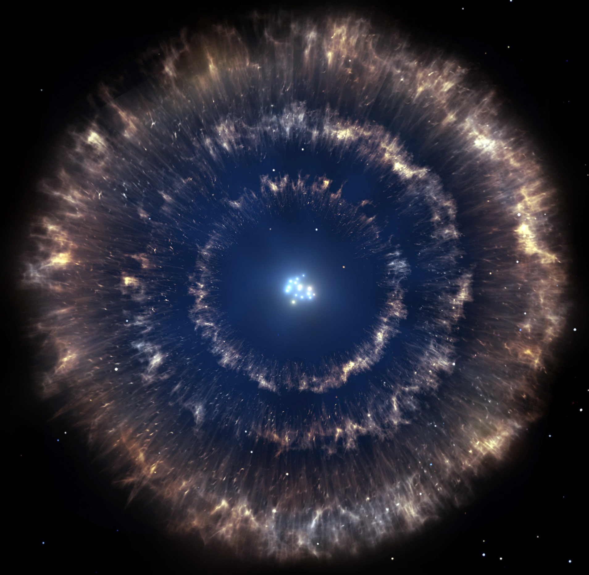 Utilizzando il telescopio William Herschel alle Canarie per cercare bolle di gas incandescente in espansione nella vicina Galassia del Triangolo (o M33), un gruppo di ricercatori ha scovato un vero e proprio esempio dimatrioska cosmica. Si tratta, infatti, del primo caso conosciuto di tre resti di supernova uno dentro l’altro. Nell’illustrazione a fianco possiamo ammirare come si presenterebbero alla vista questi tre “gusci” concentrici, in rapida espansione attorno a un ammasso stellare, composti sia dal gas violentemente espulso da stelle morenti che da materiali del mezzo interstellare circostante, spazzati dall’onda d’urto.