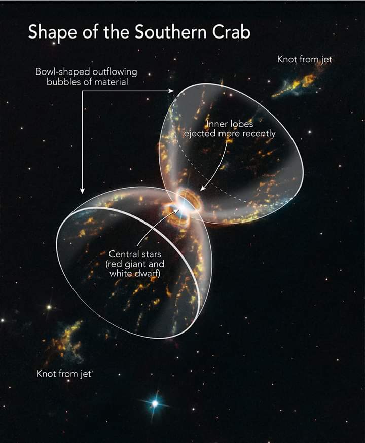 La nube, così chiamata per distinguerla dalla ben nota Nebulosa del Granchio, un resto di supernova nella Costellazione del Toro, è stata creata dalla turbolenta relazione tra un’insolita coppia di stelle al suo centro. Una delle due è una gigante rossa, una stella che ha consumato il suo combustibile nucleare, per poi gonfiarsi espellendo nello spazio gli strati gassosi esterni, attraverso un energico vento stellare. Parte del materiale espulso dalla gigante viene trascinato dalla gravità verso la compagna, una piccola e densa nana bianca, residuo derivante dalla morte di una stella simile al Sole. Quando l’accumulo di gas sulla sua superficie raggiunge una soglia critica, anche la nana bianca espelle materia nello spazio, dando luogo a un’eruzione improvvisa.