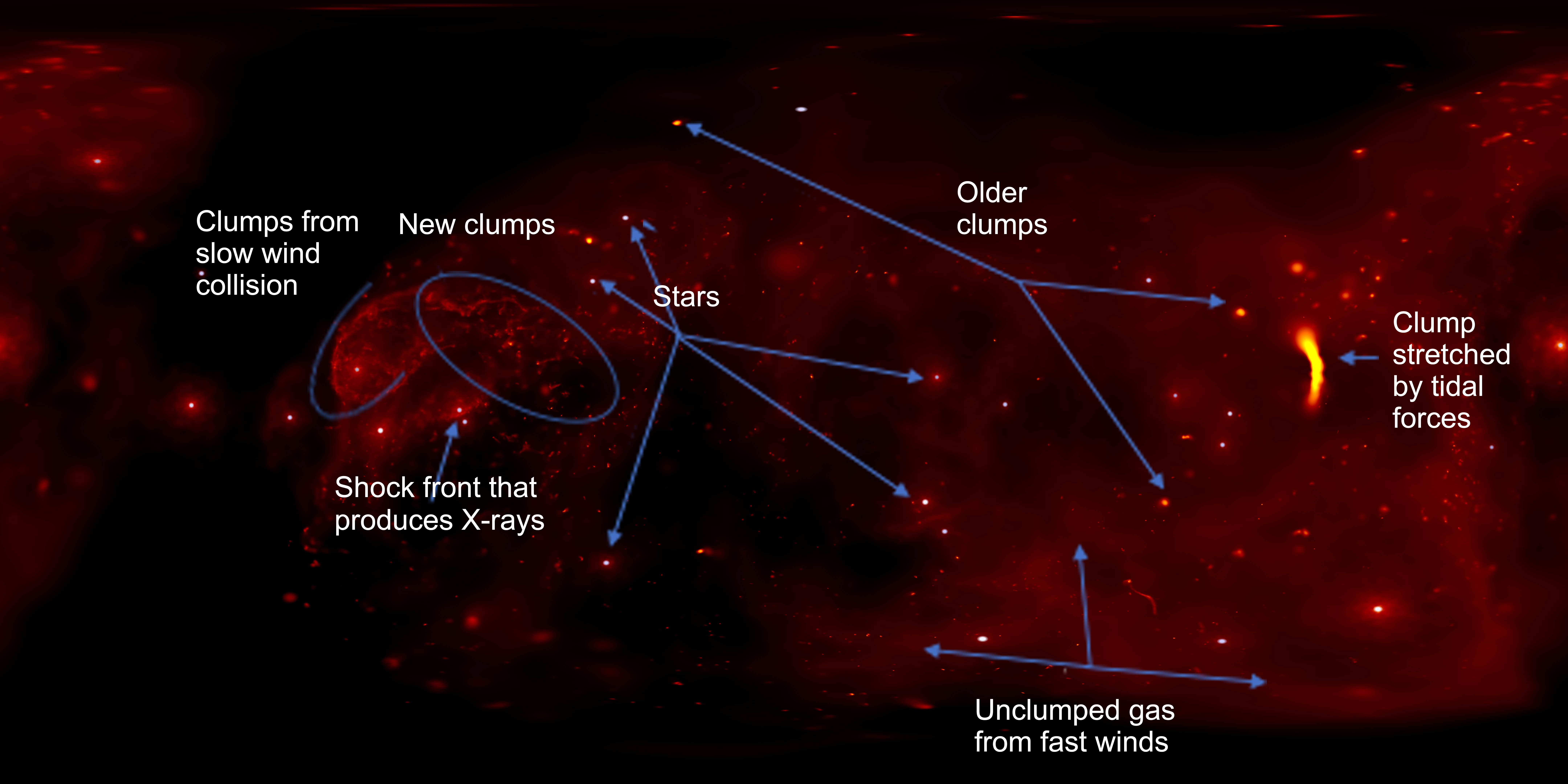 La simulazione dei 30 giganti stellari, le stelle Wolf-Rayet, che orbitano entro circa 1,5 anni luce dal centro della nostra Galassia, è stata ottenuta grzie ai dati in infrarosso del VLT. Potenti venti di gas fluiscono dalla loro superficie, trasportando parte del loro strato esterno nello spazio interstellare. Qui i gas espulsi si scontrano con gas espulsi in precedenza da altre stelle producendo onde d’urto, simili a boom sonici, che permeano tutta l’area scaldando il gas fino a milioni di gradie e facendolo brillare nei raggi X. È qui che entrano in campo le osservazioni provenienti da Chandra, che hanno fornito i dati essenziali sulla distribuzione e la temperatura di questo gas.