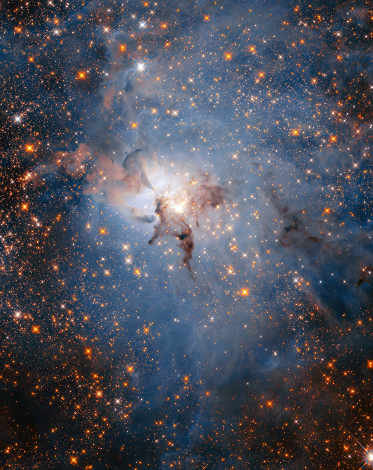 Come molti vivai stellari, la nebulosa vanta molte stelle grandi e calde. La loro radiazione ultravioletta ionizza il gas circostante, facendolo splendere luminoso e scolpendolo in forme che appaiono spettrali e ultraterrene. La stella luminosa incastonata nelle nuvole scure al centro dell’immagine è Herschel 36. La sua radiazione scolpisce la nube circostante soffiando via parte del gas, creando regioni più o meno dense.