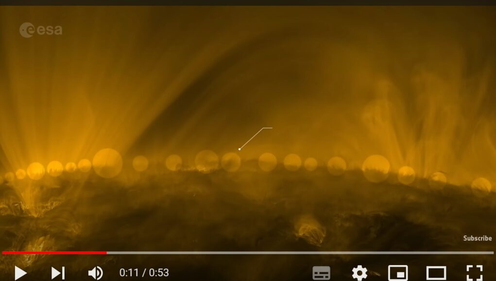 Si tratta della ripresa da vicino del Sole effettuata dalla sonda Solar Orbiter dell’ESA. Il Sole appare in continuo movimento e la sonda ha filmato la transizione dall’atmosfera inferiore del Sole alla corona esterna, molto più calda. Le strutture simili a capelli sono costituite da gas carico (plasma), che segue le linee del campo magnetico che emergono dall’interno del Sole.