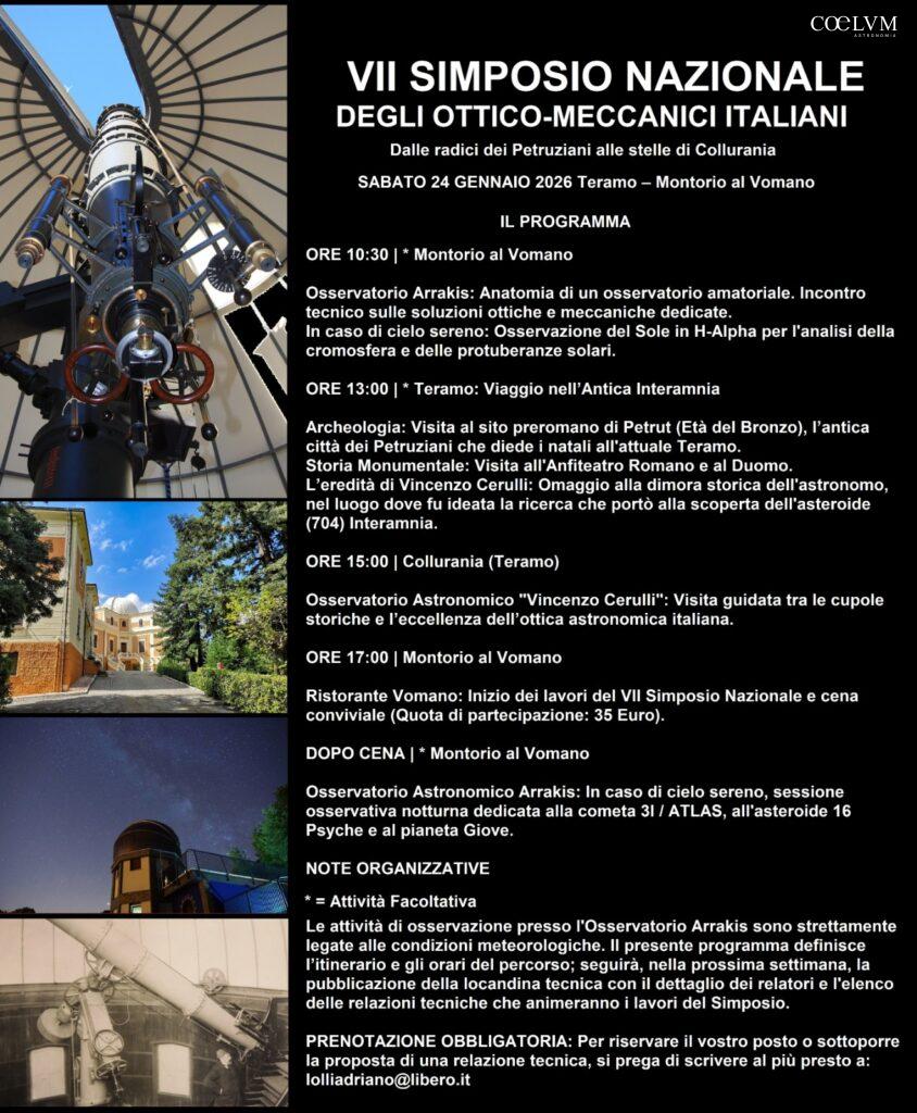 I lavori del VII Simposio Nazionale inizieranno alle 17:00 a Montorio al Vomano, presso il Ristorante Vomano, con una cena conviviale (quota di partecipazione: 35 euro). Dopo cena è previsto il rientro all’Osservatorio Astrakis per una sessione osservativa notturna, subordinata alle condizioni del cielo, dedicata alla cometa 3I/ATLAS, all’asteroide 16 Psyche e al pianeta Giove.
