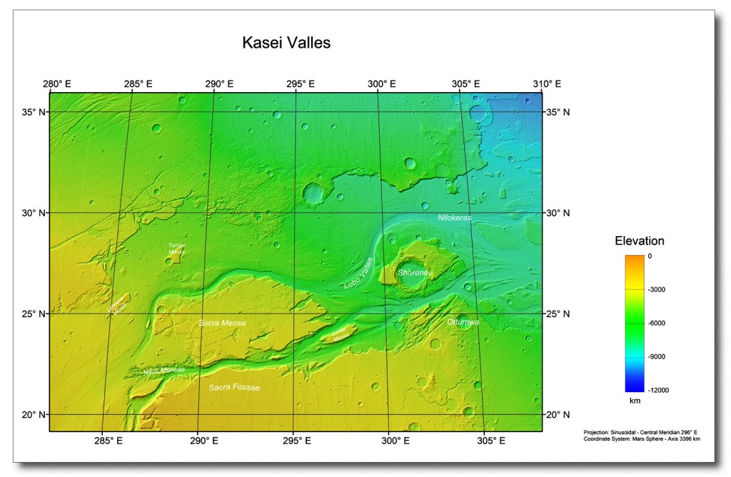 La topografia di questa zona, realizzata grazie alle immagini e alle mappe prodotte in questi ultimi anni, traccia il ritratto di un antico fiume che riserva molte sorprese nel suo percorso e nella sua travagliata storia. Analizzando la mappa topografica (cliccare sulla mappa per un ingrandimento) ci si rende facilmente conto che il canale doveva prendere origine vicino alla Valles Marineris (oltre il bordo inferiore della mappa) e dopo un lungo tragitto, riversarsi nelle vaste pianure della Chryse Planitia (oltre il bordo destro). Lungo il suo accidentato percorso, il fiume si divide in due rami che abbracciano un’isola denominata Sacra Mensa che si innalza oltre 2 km sul letto del canale. Sul fondo, sono visibili alcuni crateri più o meno erosi dalla forza della corrente. Il più grande e facilmente identificabile è Sharanov, un cratere largo oltre 100 km, ancora parzialmente intatto sul fondo del fiume e contornato da diverse e suggestive strutture formate dalle correnti violente che aggirano gli ostacoli trovati sul loro passaggio. Sempre sul letto, sono inoltre visibili dei piccoli crateri dalla caratteristica forma allungata che finisce in una coda, ad indicare che queste strutture devono essersi formate in eventi di impatto avvenuti nella zona già allagata.