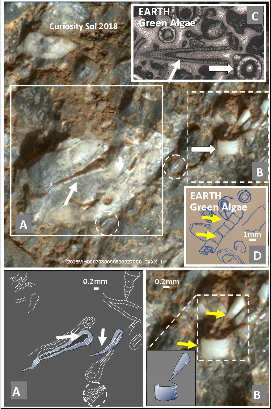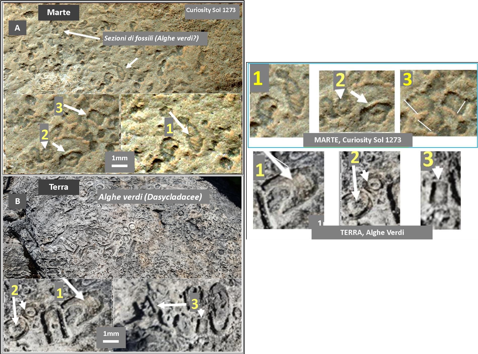 Figure 14/14a  Strutture complesse, millimetriche, mineralizzate, ancora una volta ingiustificabili con i normali processi sedimentari abiogenici, alghe verdi sulla Terra, forme perfettamente sovrapponibili nei sedimenti marziani. Sotto, in un ingrandimento delle strutture. Foto: NASA; Elaborazioni: V. Rizzo. Campione terrestre: https://www.fossilienatlas.de, file 15557290942. credit Stephan Schorn).