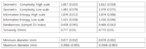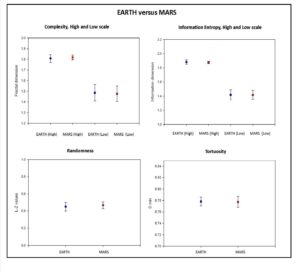 Figura 9 sopra e sotto. Sei indici frattali (complessità geometrica delle strutture, grado di ordine delle strutture, casualità, tortuosità delle forme) e i diametri medi delle forme su 15.000 microstrutture di stromatoliti/microbialiti terrestri e di 25.000 microstrutture marziane fotografate dal Rover Opportunity presso Meridiani Planum, Marte. Gli indici numerici – medie e deviazioni standard – si sovrappongono quasi con precisione con elevatissima significatività statistica (p<0.004). Stromatoliti, e quindi vita, nel lontano passato di Marte? Bianciardi, G., Rizzo, V. & Cantasano, N.. “Opportunity Rover’s image analysis: microbialites on Mars?” Int. J. Aeronaut. Space Sci. 15(4), 419–433, 2014