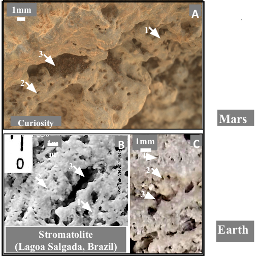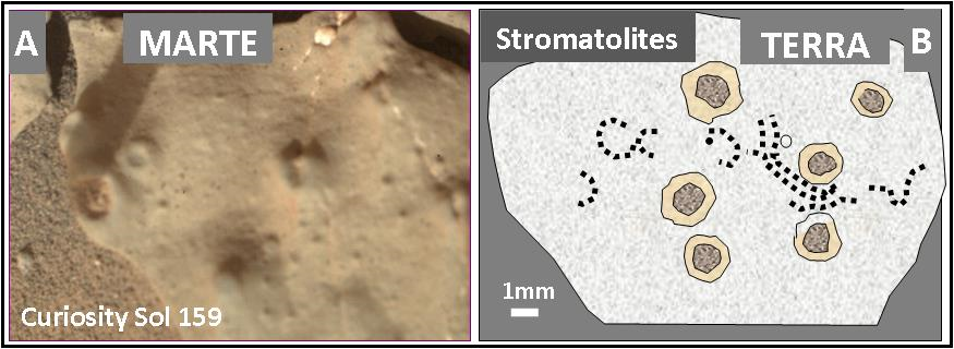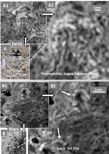 Le somiglianze morfometriche tra le strutture marziane e le stromatoliti terrestri sollevano domande intriganti. Gli indici frattali ottenuti dagli affioramenti di Opportunity e Spirit presentano un elevato grado di sovrapposizione con quelli delle stromatoliti terrestri, suggerendo una possibile connessione. Secondo alcuni studi, le prime stromatoliti su Marte potrebbero risalire a circa 3,7 miliardi di anni fa (Noffke, 2015) giustificando l’ipotesi di un trasporto di forme di vita semplice tra Terra e Marte, o viceversa, attraverso processi di litopanspermia.