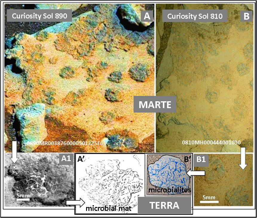 Figura 13. Strutture riprese su Marte perfettamente sovrapponibili, sulla Terra, ad un cosiddetto “tappetino” microbico, prodotto di elaborazione di microrganismi. Curiosity, Sol 890.Foto: NASA; Elaborazioni: V. Rizzo.