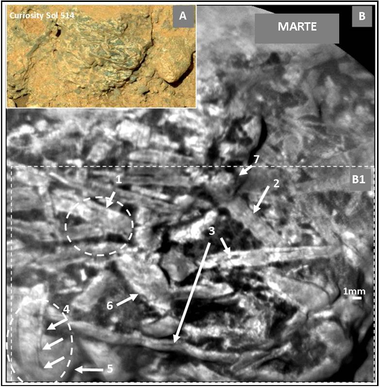 Figura 16  Un’immagine ripresa da Curiosity, poi fortemente ingrandita. 1) forme tubolari (o nastriformi), forse ramificate (cerchio tratteggiato); larghe 2-3mm elunghe fino a 2,5 cm; ma talvolta anche molto più lunghe e fortemente arcuate;2) In alcuni casi le stesse forme mostrano strozzature ripetute e regolari, ad intervalli di circa 2mm;3) Forme che sembrerebbero sempre forate e settate/segmentate internamente;4, 5) Una forma diversa, molto più larga, a guscio sottile e a strati sovrapposti (4) e ricurvi (5);6) Altra forma rappresentata da un cono largo e tozzo, cavo, con guscio a strati sovrapposti che ricorda fortemente i gusci di fossili terrestri ancestrali. Forme che testimoniano corpi flessibili, che non hanno controparti abiogene note; presentanti, invece, tratti morfologici e strutturali tipiche di varie forme di fossili di alghe verdi. Foto: NASA; Elaborazioni: V. Rizzo.