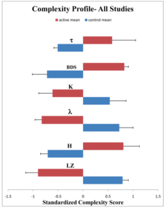 Figura 6. Analisi numerica delle oscillazioni dell’anidride carbonica (32 000 valori) rilasciata dopo l’aggiunta di pappa nutritizia al suolo marziano nei 6 test LR effettuati dai 2 Viking e in situazioni di controllo terrestri biologiche e abiologiche. L’analisi fu condotta usando sei indici non lineari: complessità del segnale (Lempel-Ziv, LZ), “memoria” del segnale (Hurst, H), sensibilità alle condizioni iniziali del segnale (Lyapunov, λ ), entropia del segnale (Kolmogorov, K), statistica BDS, correlazione temporale del segnale (τ). L’analisi statistica (cluster analysis) separa perfettamente 2 gruppi evidenziati con i rettangoli rossi e blu, rosso: un unico cluster che riunisce i test biologici terrestri con i 4 test LR “attivi” effettuati su Marte, l’altro cluster evidenziato dall’analisi statistica che si trova a riunire i test abiologici con i 2 test LR di controllo (sterilizzazione del regolite marziano prima di compiere il test LR).La significativita LR attivi su Marte + test biologici terrestri verso i controlli abiologici marziani o terrestri è elevatissima (p<0.001).G. Bianciardi, J.D. Milleri, P.A. Straat, G.V. Levin,Complexity Analysis of the Viking Labeled Release Experiments. IJASS, 13 (1), 14-26, 2012.