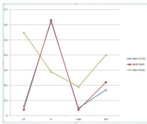 Possiamo ulteriormente “graficare” il risultato, focalizzando sui primi 6 SOL di rilevamenti da parte dell’ LR a bordo dei Viking. La coincidenza del comportamento dei vari indici caotici delle oscillazioni dell’anidride carbonica rilasciata durante l’esperimento LR su Marte con quello della CO2</sup rilasciata da batteri terrestri nelle stesse condizioni è sorprendente (figura 7).