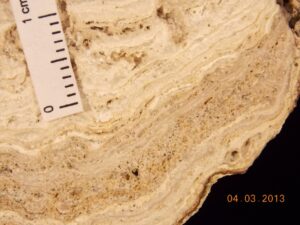 Figura 8a Sotto il marcatore (ogni quadratino=1 cm): un aspetto tipico di una stromatolite, risalente a 1,5 miliardi di anni fa. Località: Taihangshan, Cina. Foto: G. Bianciardi.