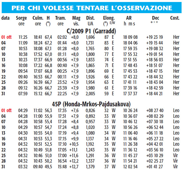 La tabella riporta il sorgere, la culminazione, l’altezza sull’orizzonte astronomico dell’osservatore raggiunta dalla cometa all’istante del transito in meridiano, e il tramonto. Sono quindi indicate: la magnitudine visuale (la magnitudine totale indicata è quella teorica calcolata in base a dei parametri fisici e geometrici; l’effettiva magnitudine visuale delle comete può risultare a volte decisamente diversa da quella tabulata), la distanza dalla Terra (in Unità astronomiche), l’elongazione dal Sole – occidentale “W” (la cometa è visibile alla mattina prima del sorgere del Sole), od orientale, “E” (la cometa è visibile alla sera dopo il tramonto del Sole) – l’Ascensione Retta, la Declinazione e la costellazione in cui si trova. Gli istanti sono topocentrici e calcolati per le 00:00 TMEC per una località situata a 12° di longitudine Est e 42° di latitudine Nord.