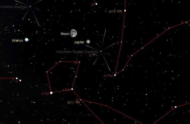 Luna Giove nella sera del 15 febbraio accompagnati dal Urano verso Ovest.
