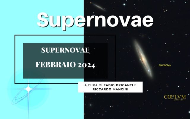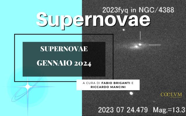 Concludiamo questa ricca rubrica con una scoperta italo-americana, che perciò ci riguarda più da vicino. Nella notte dell’11 gennaio gli astrofili Mirco Villi e Michele Mazzucato, che collaborano da diversi anni con i professionisti americani del CRTS Catalina, hanno individuato una debole stellina di mag.+18,9 analizzando immagini professionali realizzate con il telescopio Cassegrain di 1,5 metri di diametro dell’osservatorio americano sul Mount Lemmon in Arizona. La galassia ospite UGC6424 è una spirale vista di taglio, posta nella costellazione del Leone a circa 230 milioni di anni luce di distanza e situata a meno di due gradi a Nord dalla bella coppia di galassie Messier: M65 e M66. Nella notte del 17 gennaio dal Palomar Observatory in California con il telescopio da 1,5 metri è stato ottenuto lo spettro di conferma, che ha permesso di classificare il nuovo oggetto come una supernova di tipo II, assegnandole la sigla definitiva SN2024wp.