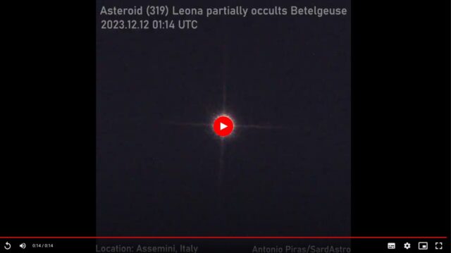 Nella notte fra l’11 e il 12 dicembre, come previsto, l’asteroide Leona ha occultato la stella Betelgeuse. Antonio Piras, autore di Coelum e instancabile astrofilo, non ha mancato l’appuntamento, ecco le sue parole: