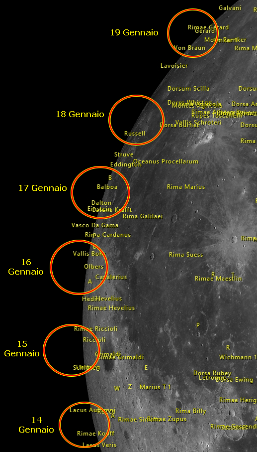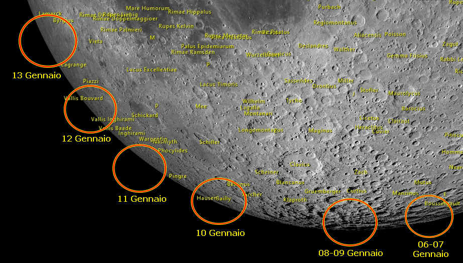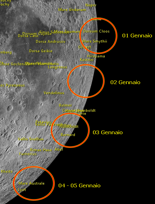 Si precisa che, per ovvi motivi, non vengono indicati i giorni in cui i punti di massima Librazione si discostano dalla superficie lunare illuminata dal Sole.