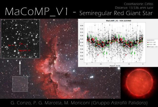 Gli autori Paolo Giangreco Marotta, Giuseppe Conzo e Mara Moriconi scoprono così una nuova stella variabile a 13.500 anni luce da noi nella costellazione del Cefeo, denominata ora con l’acronimo MaCoMP_V1