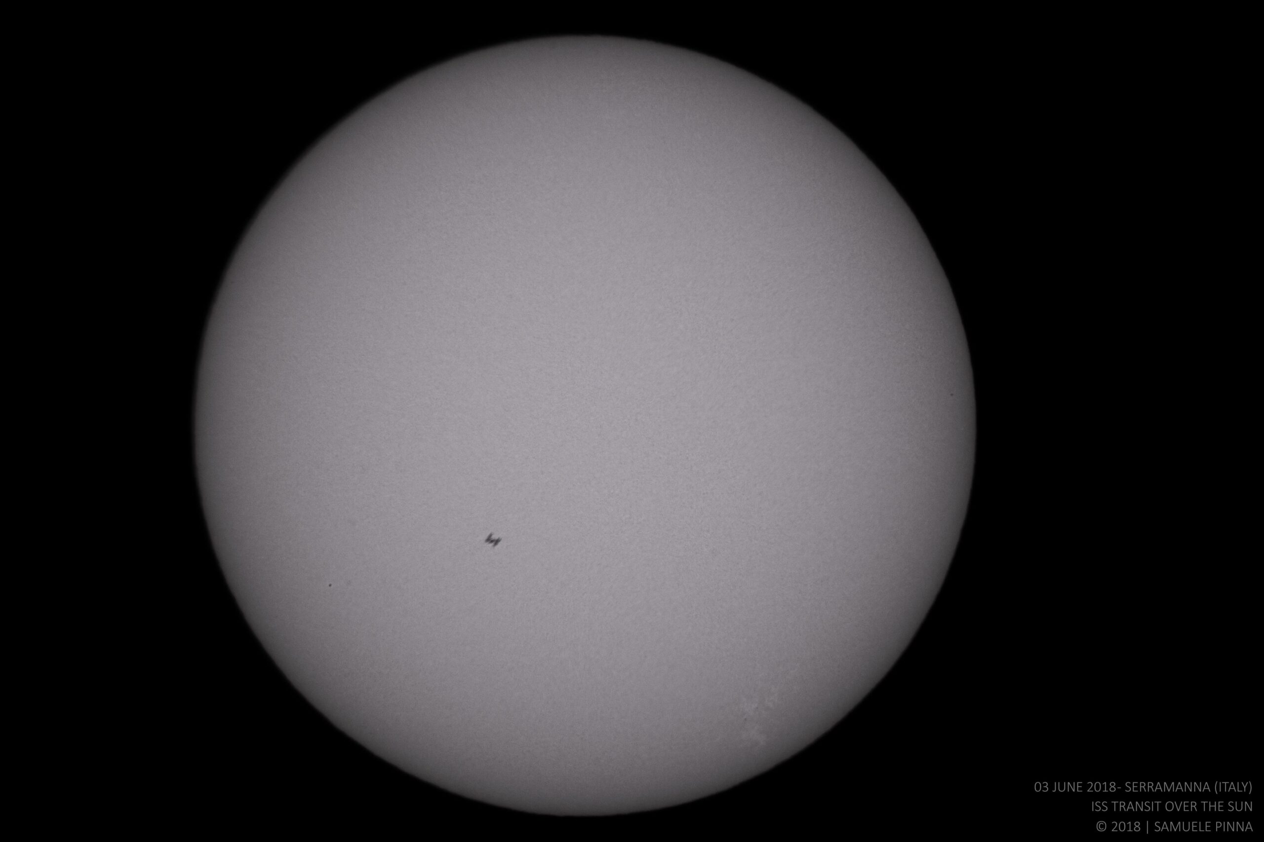 (Serramanna) Passaggio della ISS (Stazione Spaziale Internazionale) davanti al sole ripreso il 03/06/2018 da Serramanna alle ore 17.24. L’immagine immortala il transito apparente della ISS (posizionata a 350 km da terra e lanciata a 28.000 km/h) sul disco solare. La ripresa è stata effettuata con Canon 60D modificata Baader a fuoco diretto su telescopio Tecnosky 65/420, Barlow 2.5x e filtro solare Astrosolar.