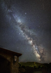 Il nuraghe Goni si trova a circa 1 km di distanza dal paese omonimo ed è raggiungibile imboccando una stradina in salita che si trova poco prima dell’ingresso al centro abitato. Lasciata la macchina in una piazzola si prosegue a piedi per circa 300 m lungo un sentiero lastricato in salita. La serata di ieri è stata divertente e ricca di compagnia: dai cani pastore che hanno accompagnato la salita al nuraghe, alle decine di asinelli e capre presenti attorno al nuraghe, per finire con l’incontro con il proprietario degli animali allarmato dalle nostre pile. L’arco della via lattea, chiara ed imponente come non mai, incastonava perfettamente il nuraghe in un virtuale simposio di epoche che furono. Non ho potuto far a meno di pensare che entrambi in effetti erano li in quel momento ma rappresentavano l’eco di luci e civiltà provenienti da migliaia di anni prima: in un certo modo quel posto, in quel momento, era un’ autentica porta temporale con il passato.