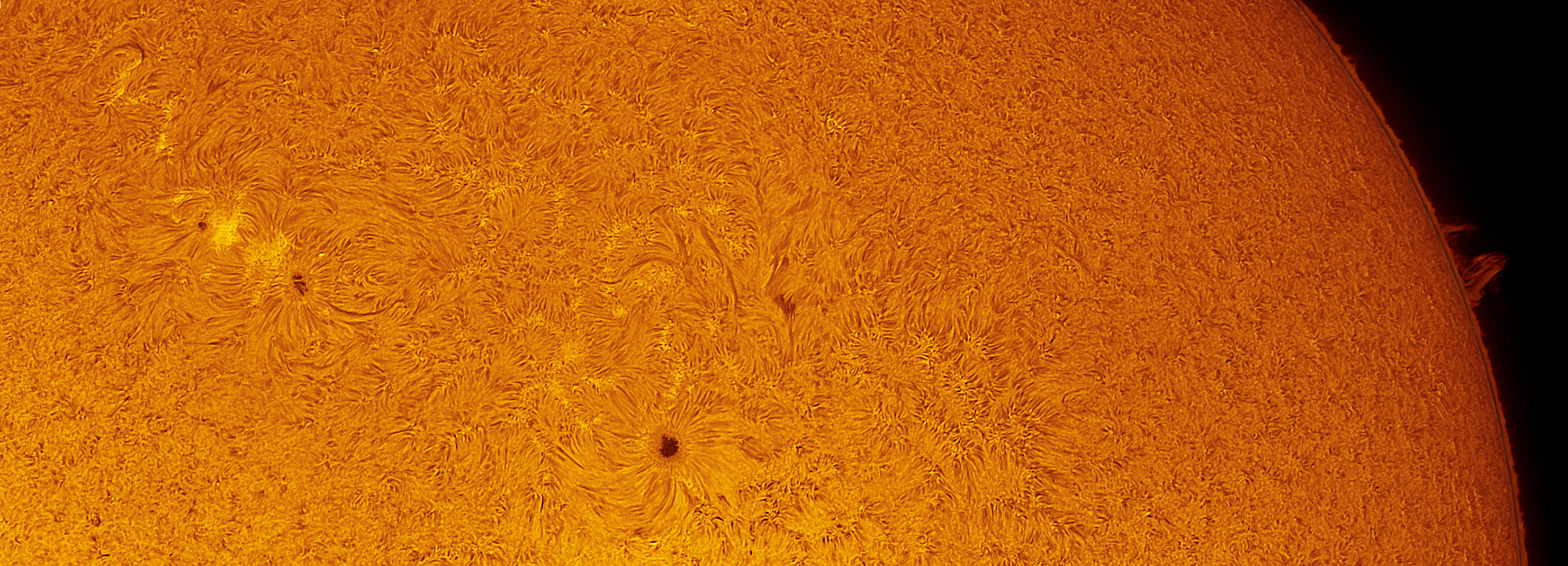 Il Sole in H-Alpha ripreso da Alle il 27 dicembre 2020. L’immagine è un mosaico di 2 pannelli che mostra le regioni attive AR 2794 e 2795 e una grande protuberanza sul bordo. Particolare notevole è la macchia più grande di AR 2795, che è stata ripresa mentre si sta dividendo in due.