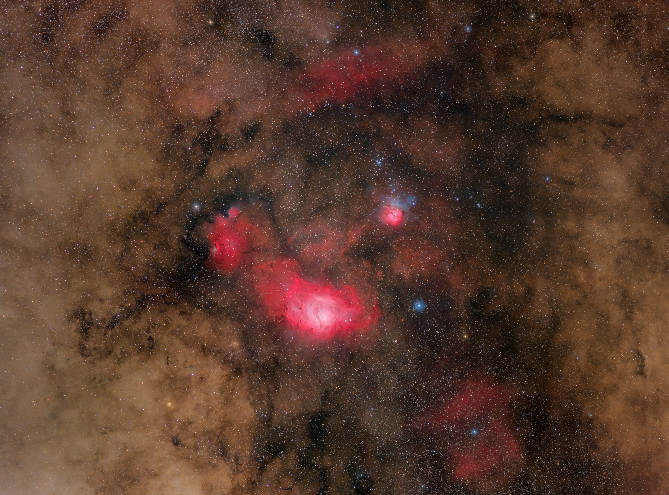 Queste tre luminose nebulose sono un classico del cielo estivo situato nei pressi del centro della Via Lattea.Il gruppo è composto dalla grande M8 o Nebulosa Laguna, dalla colorata M20 o Trifida e da NGC 6558, a sinistra di M8 e da essa separata da una striscia di polveri scure.