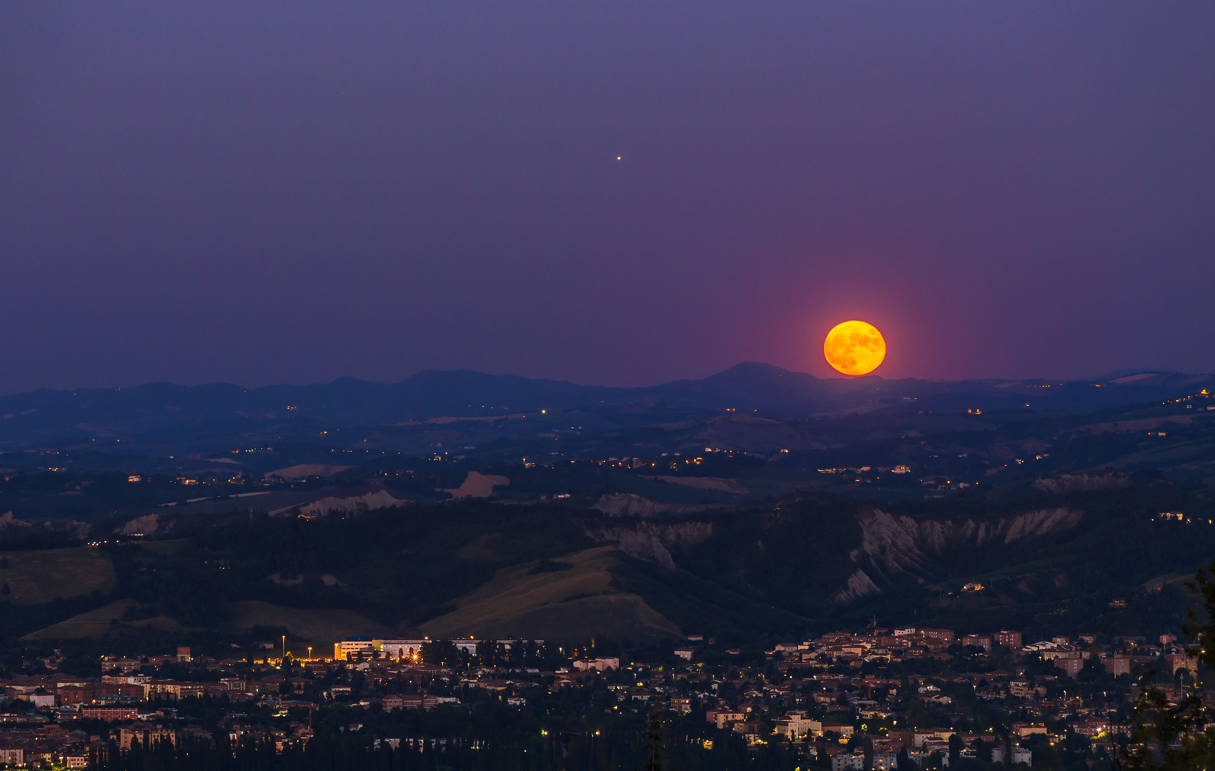 La Luna (quasi) Piena sorge in congiunzione con il pianeta Giove nel cielo del crepuscolo crepuscolo. Sullo sfondo Sassuolo e le colline bolognesi