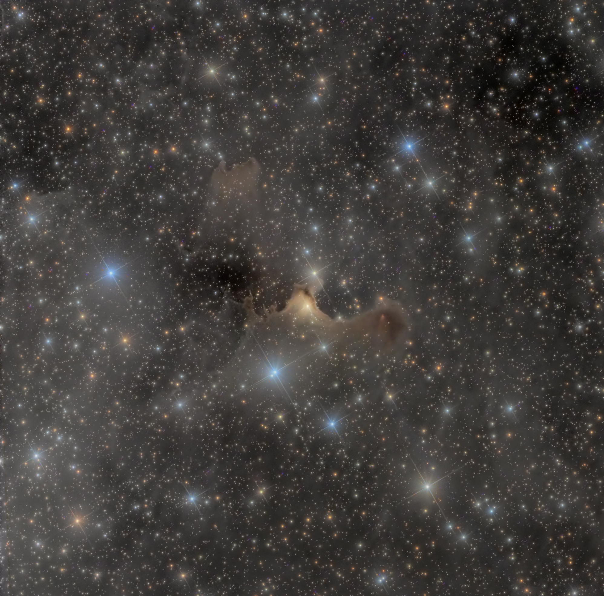 La nebulosa VdB 141 o Sh2-136 comunemente chiamata Nebulosa Fantasma per la sua forma è un globulo di Bok isolato. I globuli di Bok sono le aree di una nebulosa in cui il gas condensa e iniziano a formarsi nuove stelle. La nebulosa è immersa in un’ampia area di polveri interstellari che debolmente riflettono la luce delle stelle vicine ed emergono, come in questo caso, nelle fotografie a lunga esposizione.