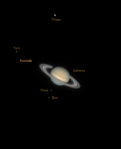 I satelliti risultano leggermente allungati, credo l’effetto di un inseguimento centrato su Saturno.