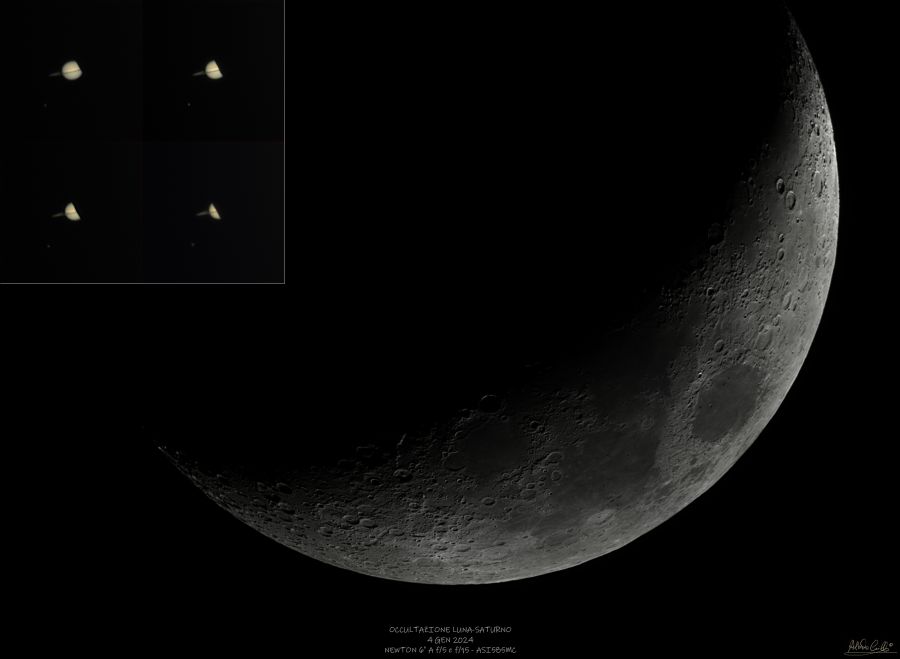 L’immagine riprende la bella falce di Luna poco prima che inizia l’occultazione di Saturno. In alto al sinistra i momenti clou dell’occultazione. La stella in basso a sinistra di Saturno e 85 Aquari.