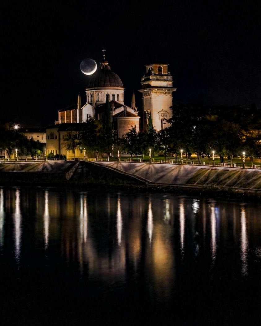 Una sottile falce di luna al 4%, nel giorno dell’equinozio di primavera, si posa dolcemente sulla cupola della chiesa di San Giorgio in Braida. F/5.6 200.0mm 3s ISO-200 Pianificazione con Planit Photo Pro