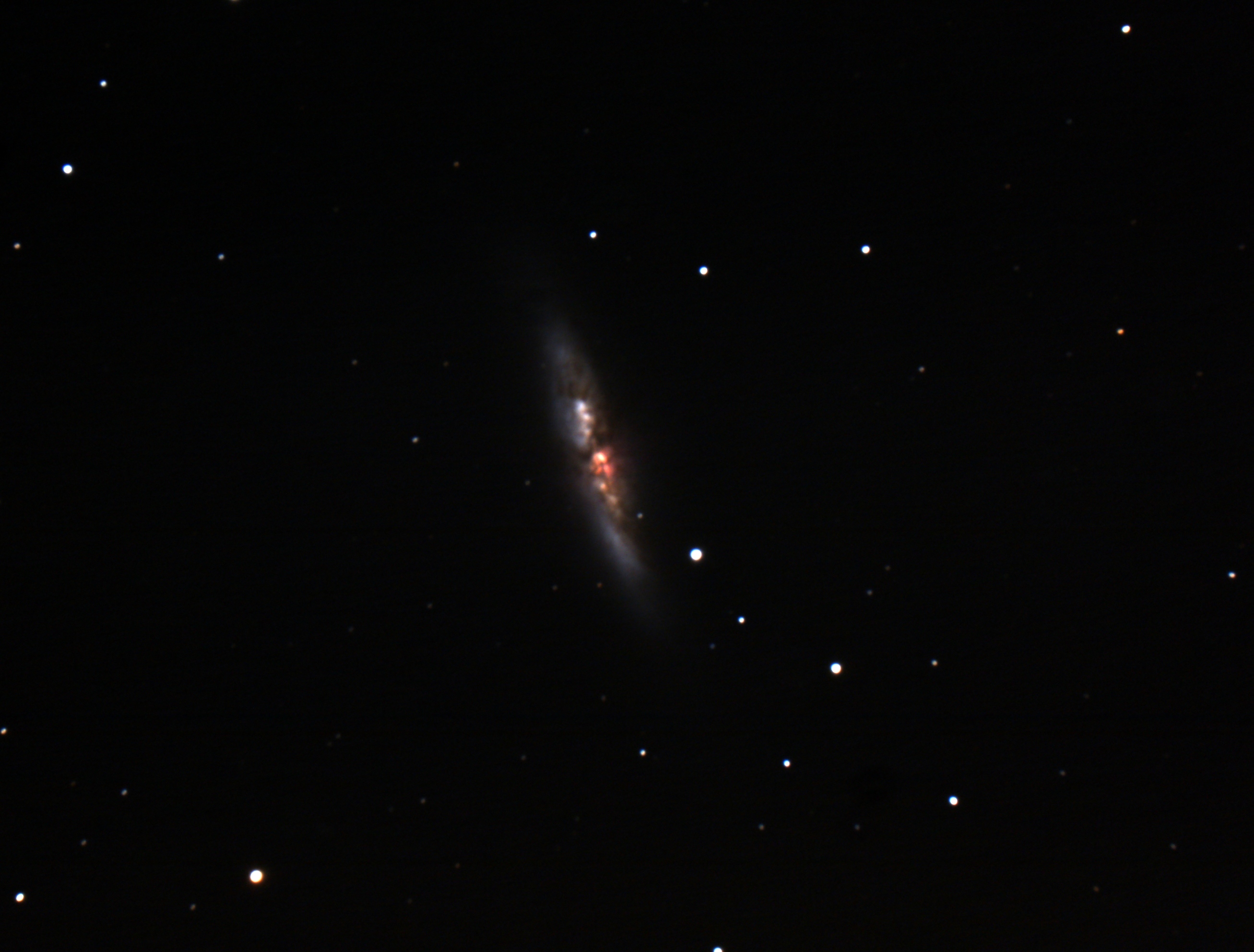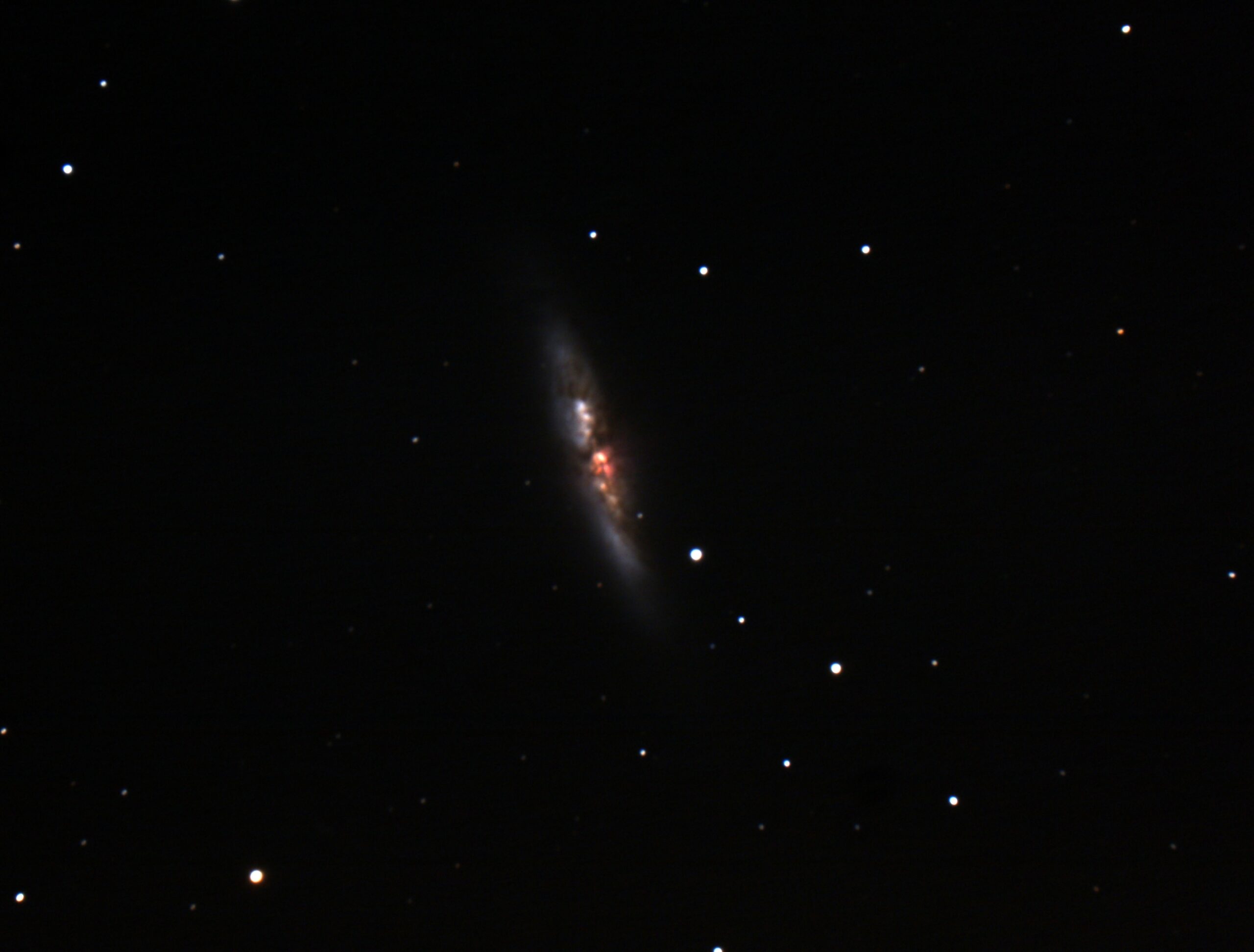 Dopo m57 ho tentato di riprendere questa famosa galassia nell’orsa maggiore.Purtroppo le condizioni del cielo sono peggiorate,varie nuvole di passaggio e il cielo che e’ rimasto comunque velato.Niente "starburst" visibile quindi.Totale di 120 pose da 1 minuto senza inseguimento con mak rumak da 228mm e 2000mm di focale con riduttore ap ccdt67 a 0,65x.Camera central ds astro60d a 1600 asa.Montatura 10 micron 1000hps.Crop dell’immagine originale.