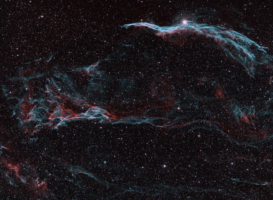 Immagine in bicromia della nebulosa Velo dell’Ovest, chiamata anche Scopa di strega; filtri rosso (Ha) e blu (OIII).