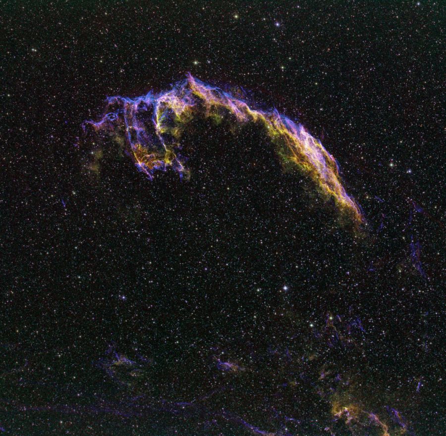 Parte orientale dl resto di supernova che si trova nella Costellazione del Cigno; chiamato anche Veil loop, qui ripreso in tricromia a banda stretta (Ha, OIII, SII).