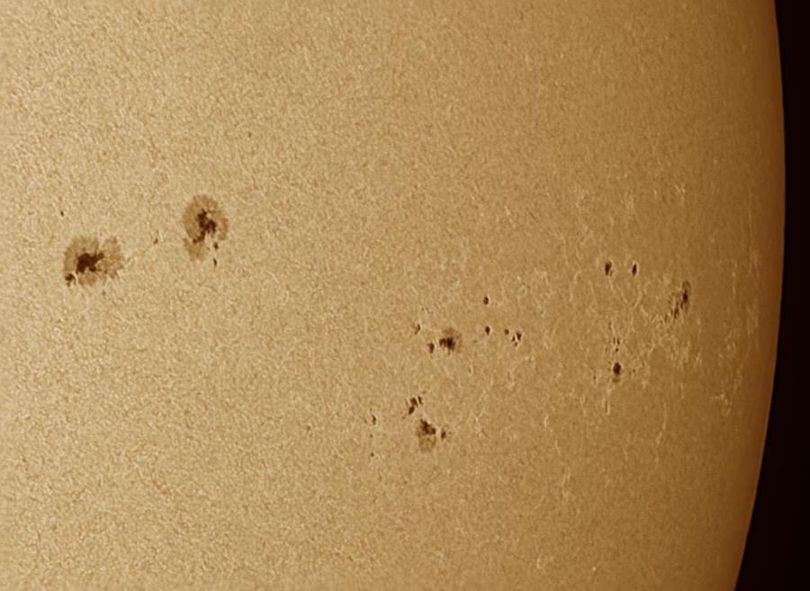 Regioni attive 4054 e 4040 il 9 aprile, riprese con un filtro solar continuum e il prisma di Herschel cool ceramica. Colori non reali.