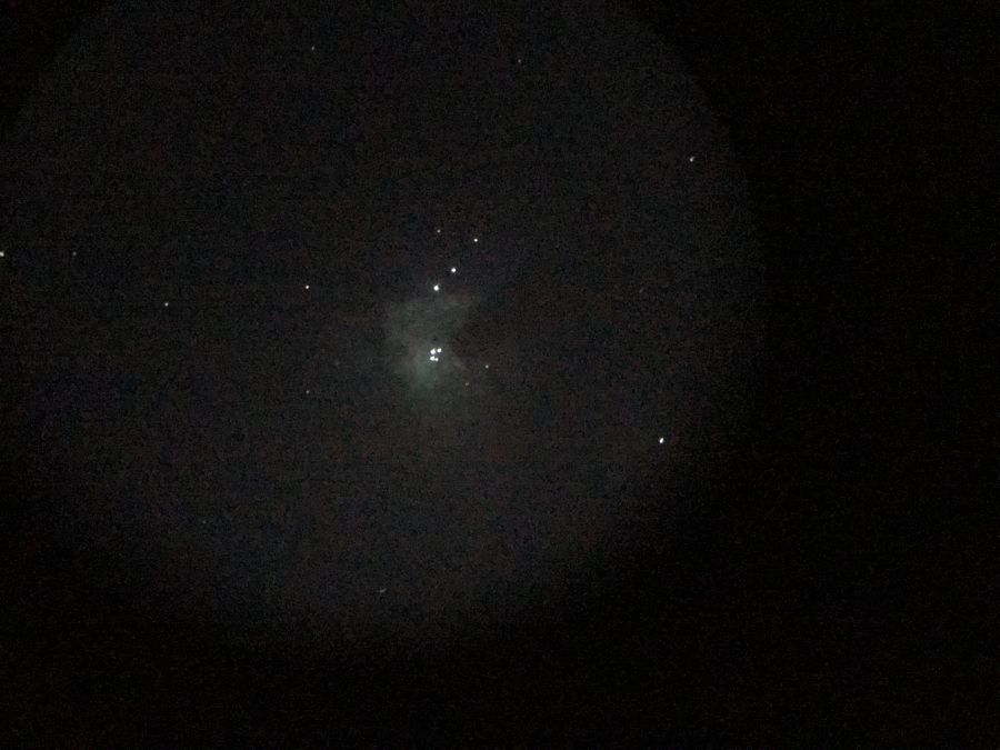Qui è la ripresa della nebulosa orione, uno delle nebulose più grandi e brillanti del cielo terrestre, alle 06:24 l’ho scattata da iPhone 7 mettendolo a fuoco nell’oculare superplossl 10mm. la nebulosa a occhio nudo si è vista nitida, come una macchia grigio-bianca con le quattro stelle del trapezio, merito all’elevato diametro dello strumento in mio possesso. il Dobson Monolitico 254mm della Skywatcher.