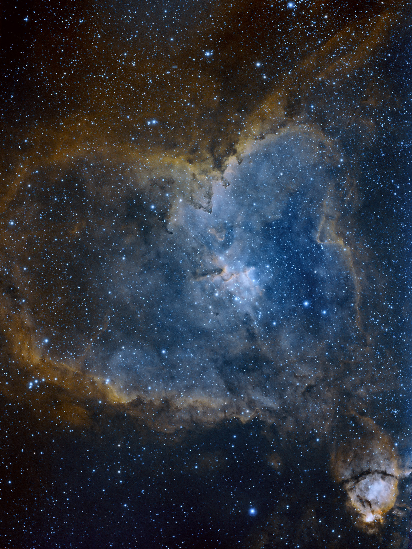 La nebulosa Cuore (IC 1805), nebulosa diffusa associata ad un ammasso aperto, nella costellazione di Cassiopea. Ripresa in H-alfa (180 min.) e OIII (180 min.), con elaborazione "bicolor" (R=H-alfa, G=Ha*0.6+OIII*0.4, B=OIII). Elaborazione in PixInsight, tocchi finali in Photoshop.