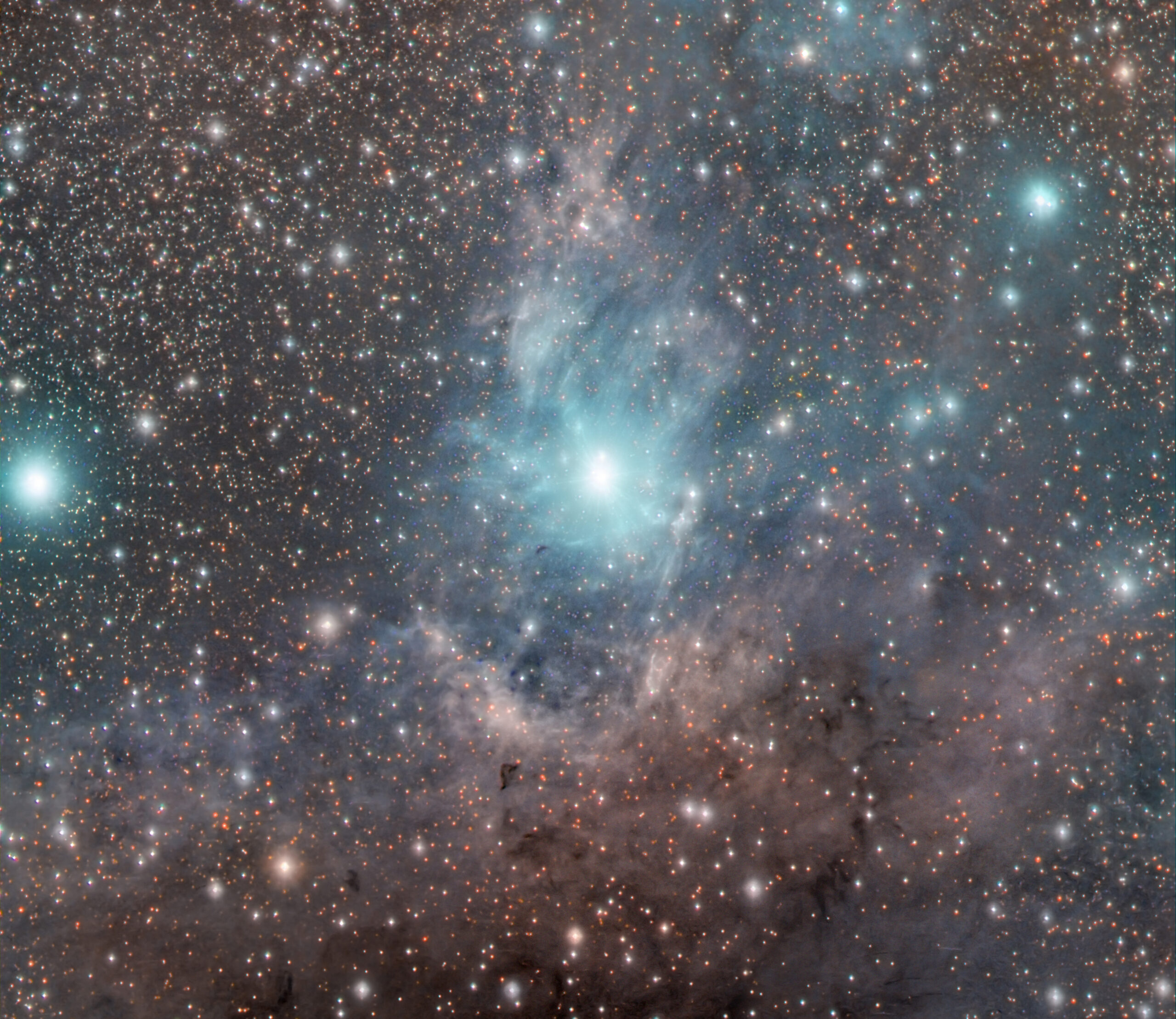 Mi hanno sempre affascinato le nebulose a riflessione.Le stelle che le illuminano infatti sono come "bengala" nella notte, che con la loro luce ci mostrano tutto un contesto di polveri che altrimenti non sarebbe visibile.Nell’immagine proposta si può vedere l’oggetto n.14 del catalogo di VdB, illuminato da una giovane stella la cui luce però non è sufficiente ad eccitare le immense nubi di idrogeno che la circondano.