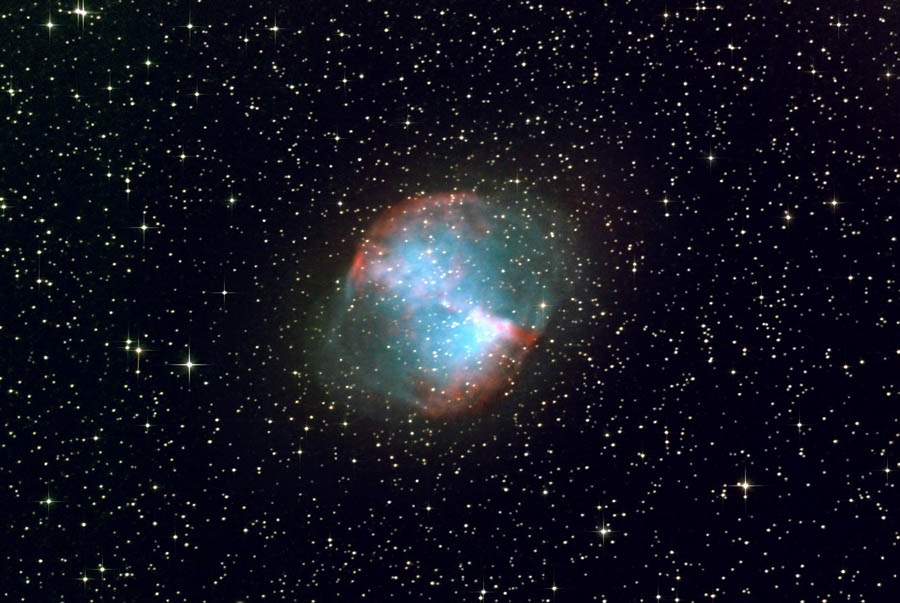 Dumbbell Nebula nella Volpetta. Ripresa effettuata dal Monte Labbro con una Nikon D80 non modificata al fuoco di uno Celestron C9.25 su montatura EQ6 Sky Scan