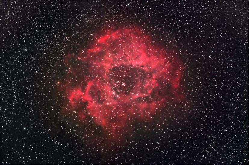 NGC2244 Nebulosa Rosetta nel Monoceros con Digicam. Ripresa effettuata con una Nikon D80 non modificata su uno Sky Watcher ED80 ridotto a f:6, montatura EQ6, guidato manualmente con una webcam su MTO 1000 e software k3ccd. Senza l’ausilio del filtro non credo che avrei potuto ottenere niente a causa del notevole inquinamento luminoso. L’unico rimpianto è che ho iniziato tardi ed ho dovuto interrompere dopo sole 4 pose.