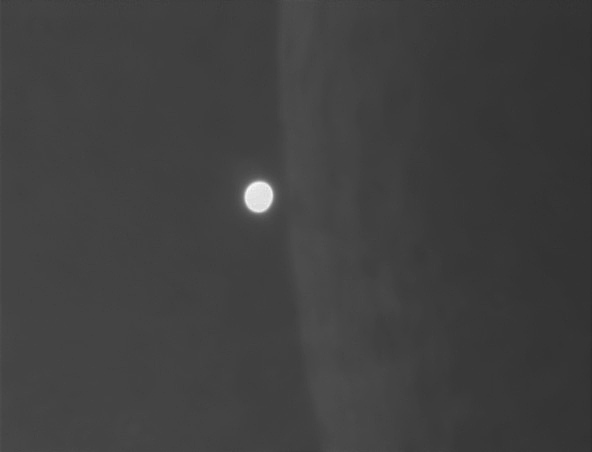 Foto dell’occultazione di Venere (mv -3,9 fase 89%) da parte di un falcetto di Luna ( mv -6,3 fase 5%) del 19 settembre 2025 in pieno giorno (poco dopo le ore 14) ; ripresa con camera Imaging Source DMK 21 al fuoco diretto di SC da 8″.