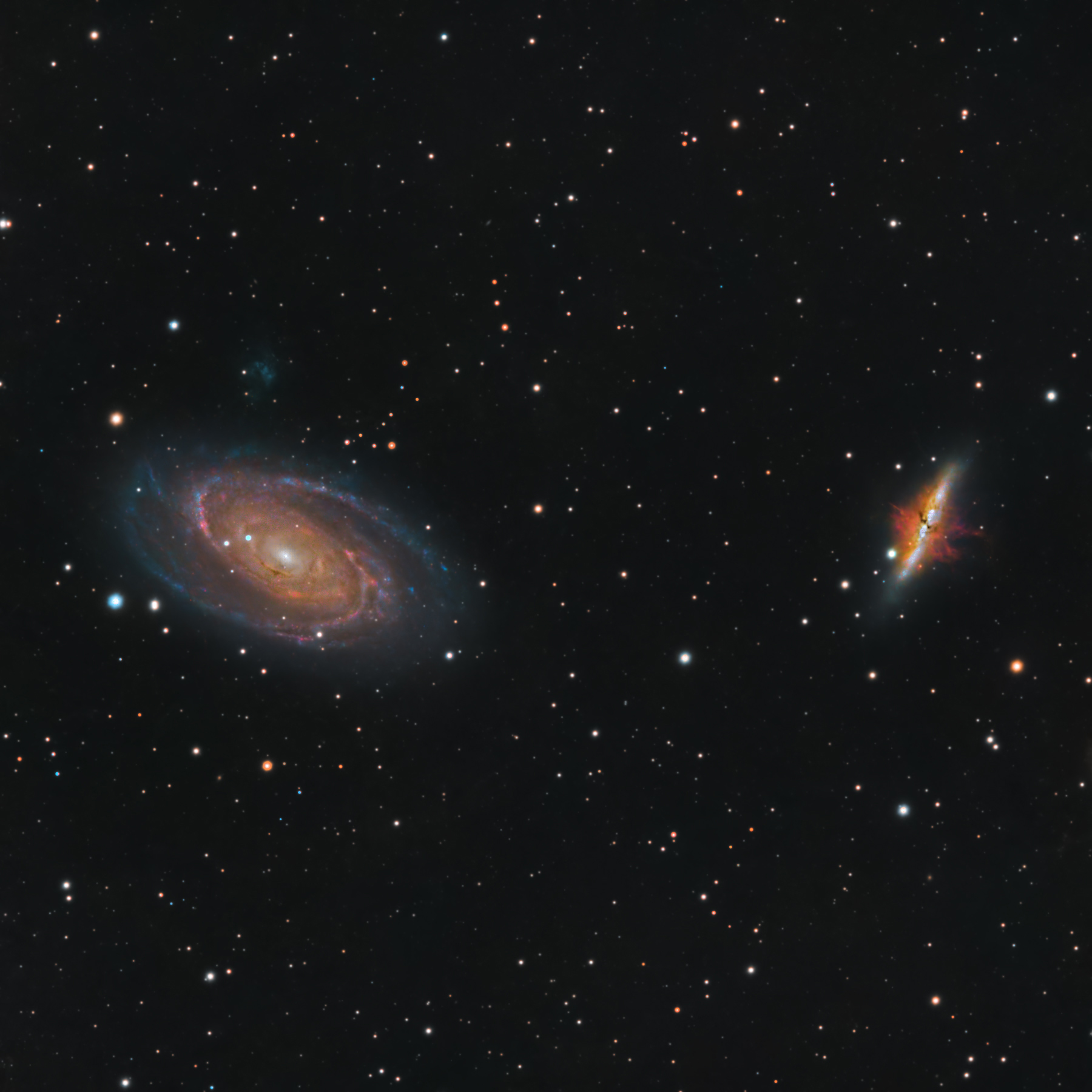 A destra nell’immagine troviamo la Galassia Sigaro o M82, uno dei più caratteristici oggetti celesti che costellano i cieli serali delle nostre latitudini. M82 è una galassia a spirale barrata che si trova a circa 12 milioni di anni luce da noi, in direzione della costellazione dell’Orsa Maggiore.