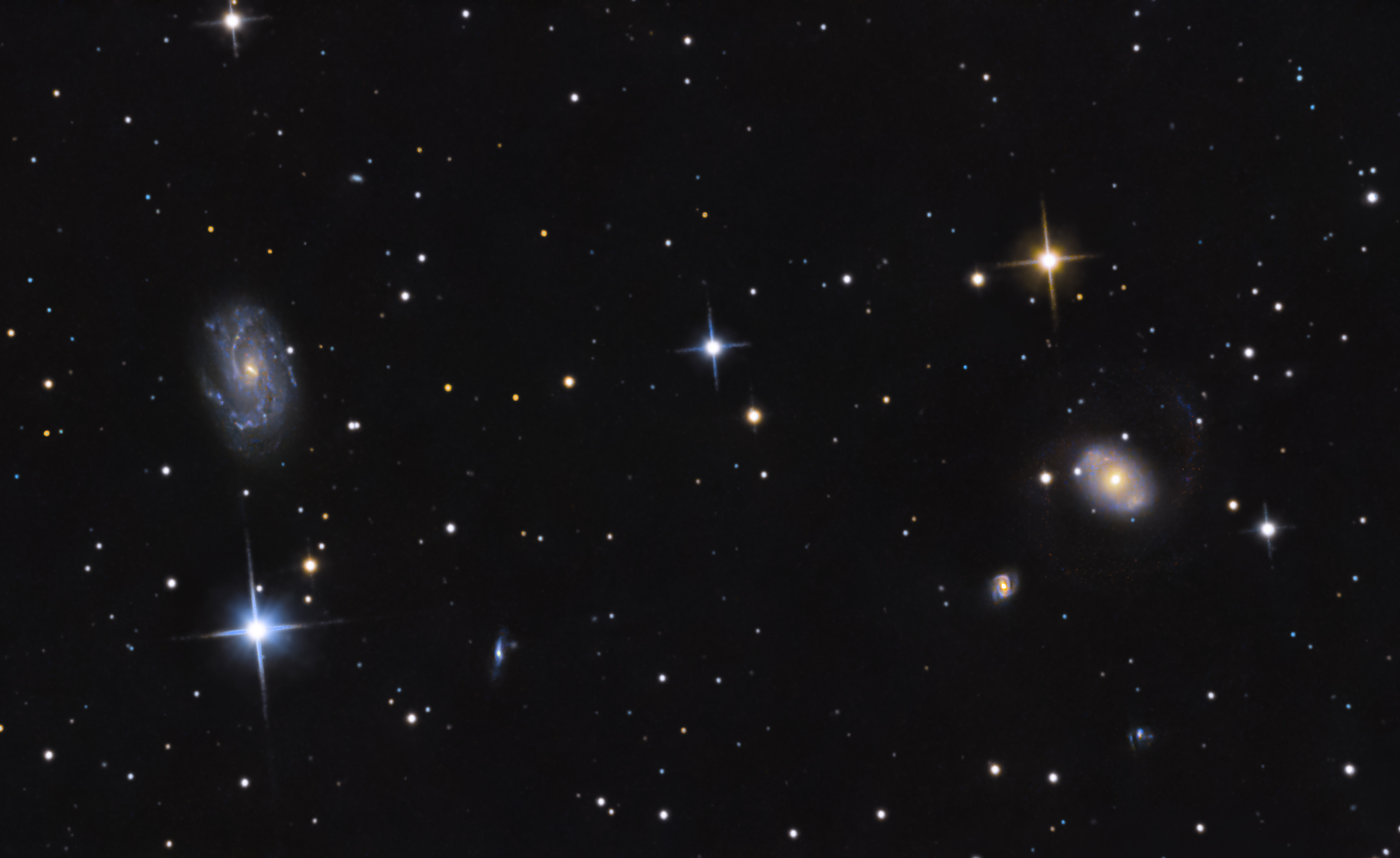 NGC 4145, a sinistra, è una galassia spirale barrata. Questa galassia sembra essere caratterizzata da scarsa formazione stellare, tranne che ai bordi esterni. A causa della perdita di energia che si verifica senza formazione stellare, alcuni astronomi prevedono che la galassia degenererà in una galassia lenticolare nel prossimo futuro. Tuttavia, l’interazione della galassia con la compagna NGC4151 potrebbe supportare la formazione stellare.