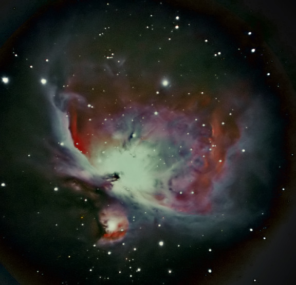 . Immagine della nebulosa M42 in Orione ripresa con il Maksutov Meade ETX 90 a f/6.3 e Canon Eos 350D non modificata. Somma di 4 immagini rispettivamente di 2-4-6-8 min. a 800ISO. Acquisizione Nebulosity elaborazione Photoshop e NeatImage.