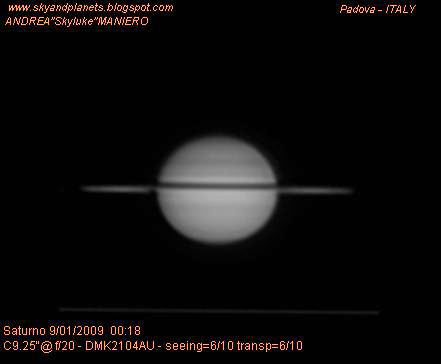 . Saturno ripreso con C9.25″ a f/20, barlow 2x ED 2″, camera ImagingSource DMK21AU04 .